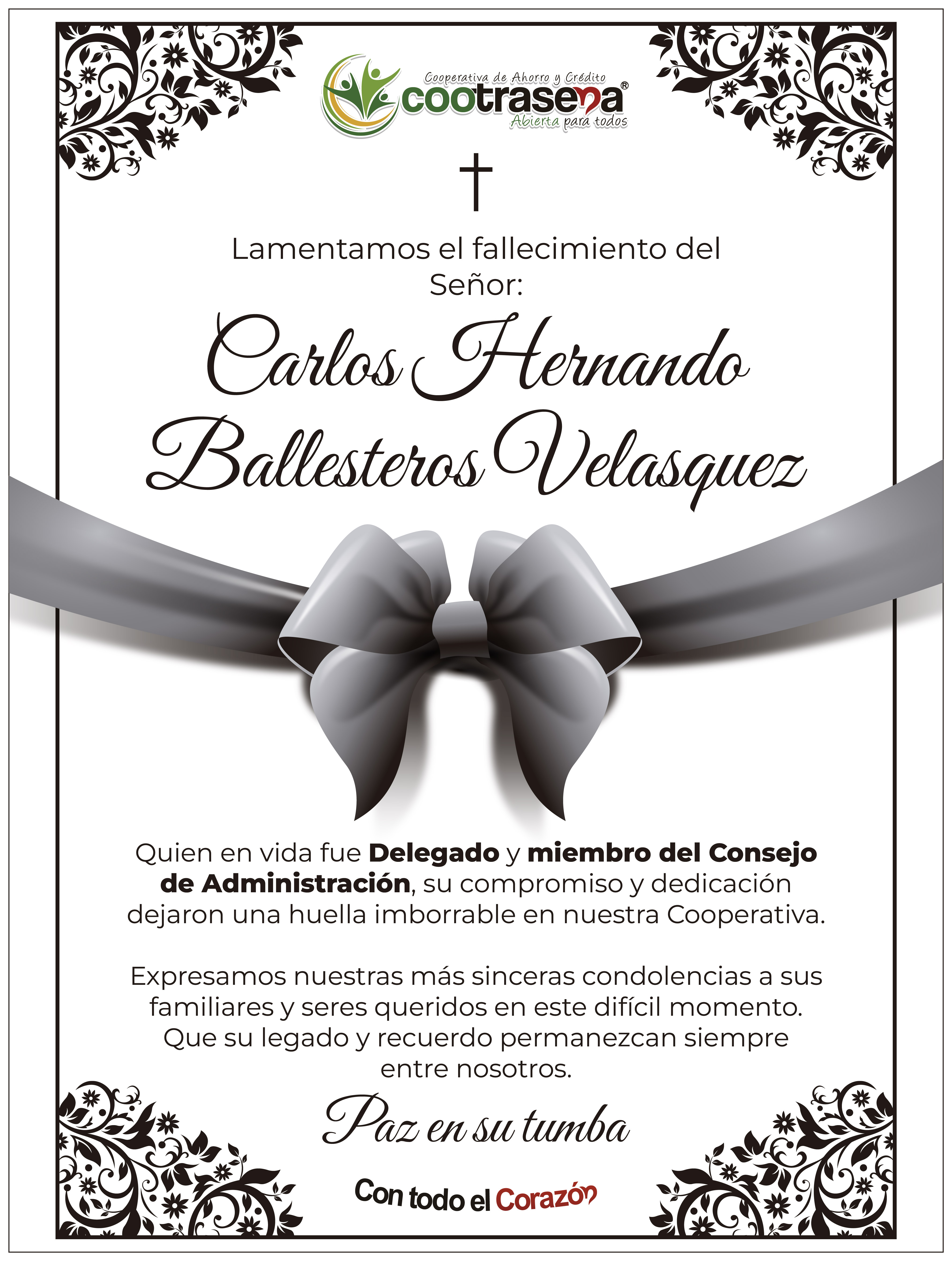 Con profundo pesar lamentamos el fallecimiento del señor Carlos Hernando Ballesteros Velasquez, quien en vida fue Delegado y miembro de la Consejo de Administración. Su compromiso y dedicación dejaron una huella imborrable en nuestra Cooperativa.
