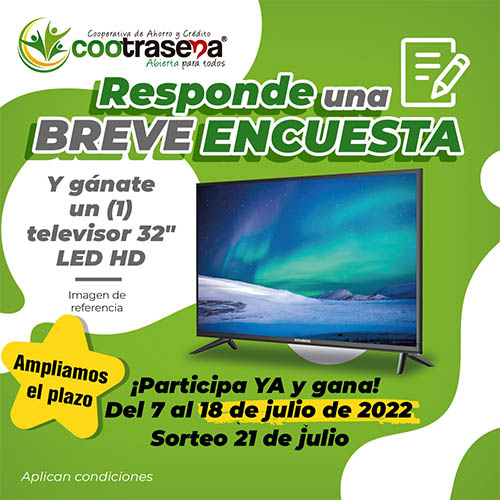 Te invitamos a diligenciar esta breve encuesta y participa en el sorteo de un (1) televisor de 32 pulgadas LD HD.
