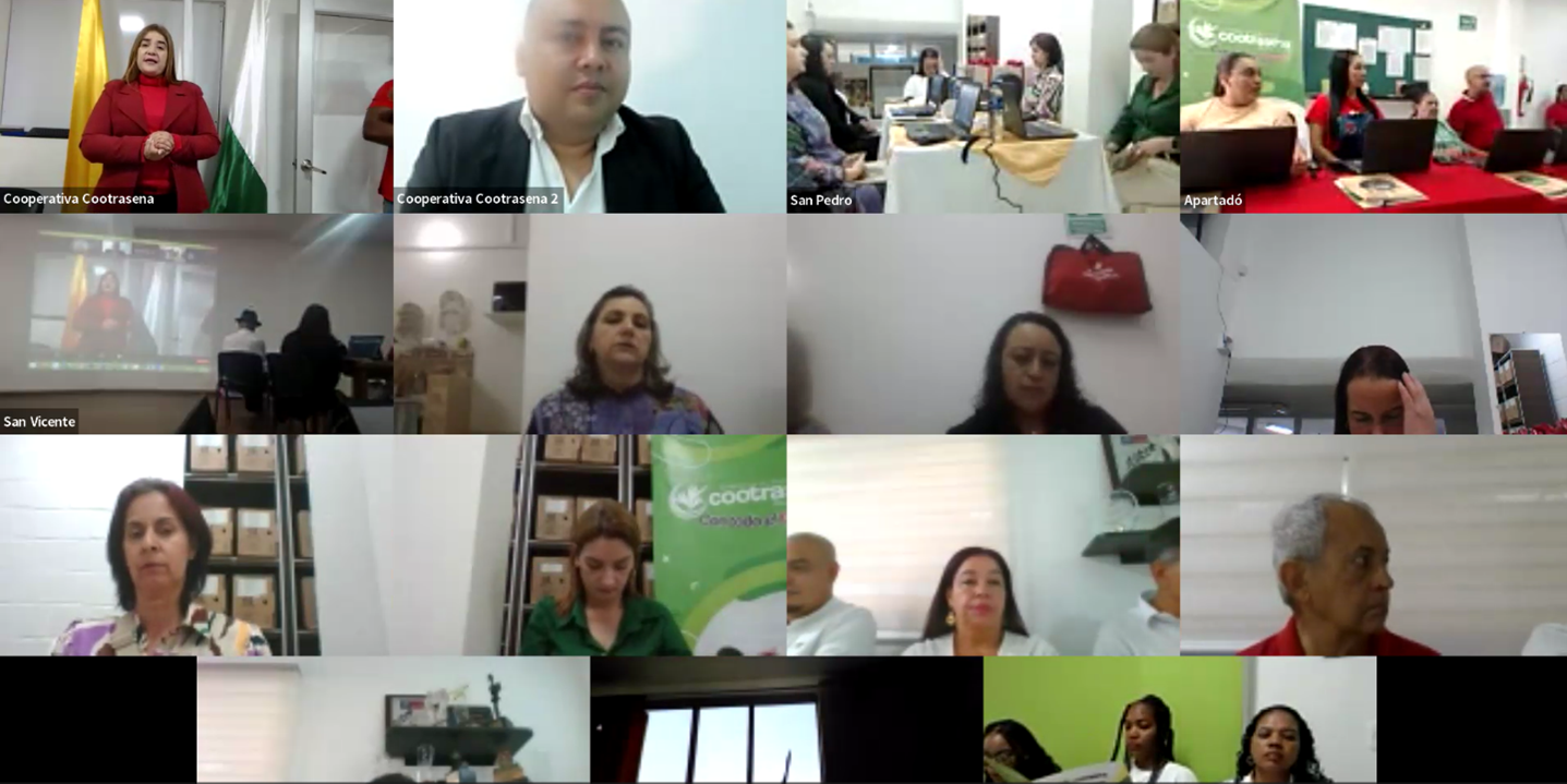 | Delegados de la oficina Medellín durante su conexión a la Asamblea, en compañía de integrantes de la Junta de Vigilancia, la Gerente(e) de COOTRASENA. |